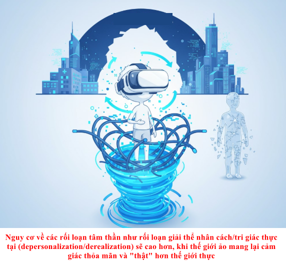 - Mất Kết nối Thực tại: Nguy cơ về các rối loạn tâm thần như rối loạn giải thể nhân cách/tri giác thực tại (depersonalization/derealization) sẽ cao hơn, khi thế giới ảo mang lại cảm giác thỏa mãn và “thật” hơn thế giới thực.