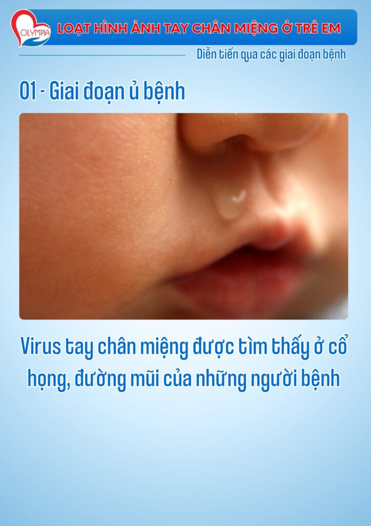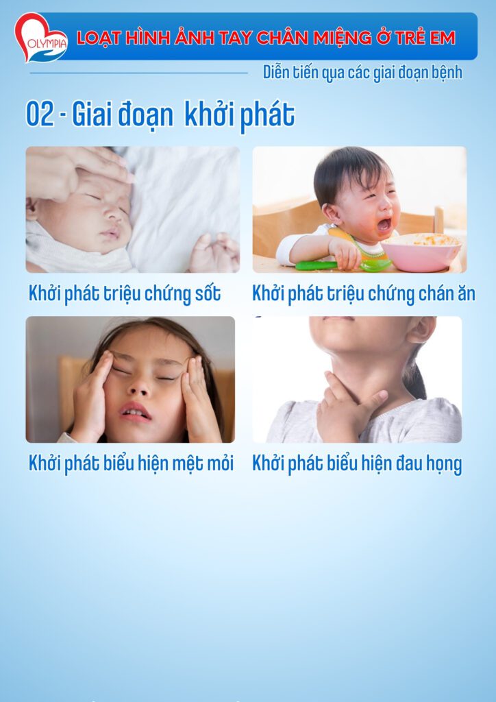 | Khởi phát | Sốt nhẹ hoặc sốt cao, mệt mỏi, đau họng, biếng ăn, chảy nước bọt nhiều. |