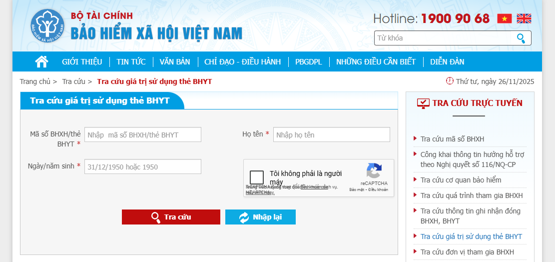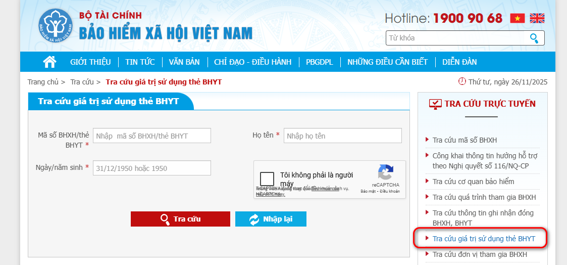 Bước 2: Chọn “Tra cứu trực tuyến“ -> “Tra cứu giá trị sử dụng thẻ BHYT”.