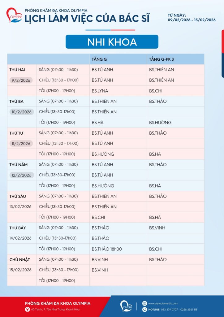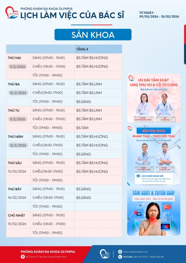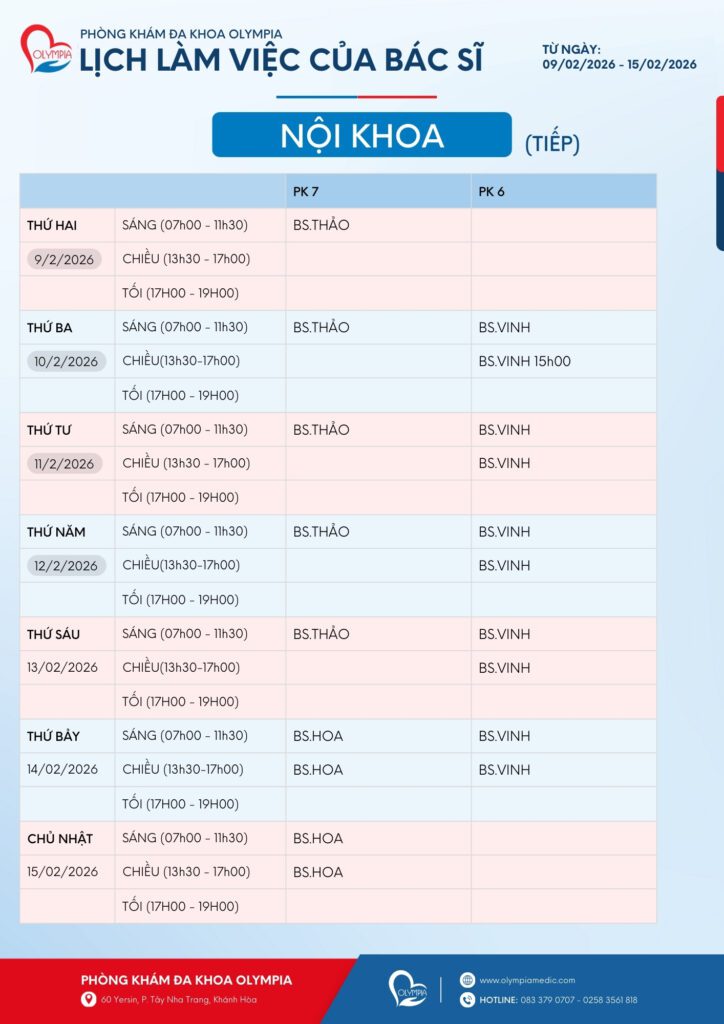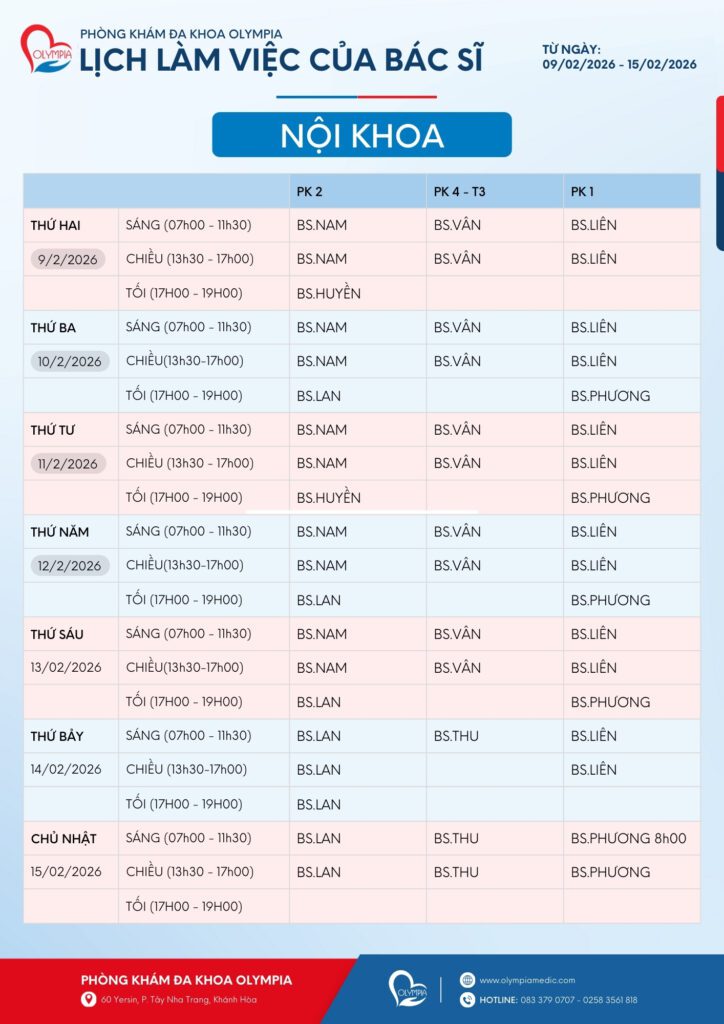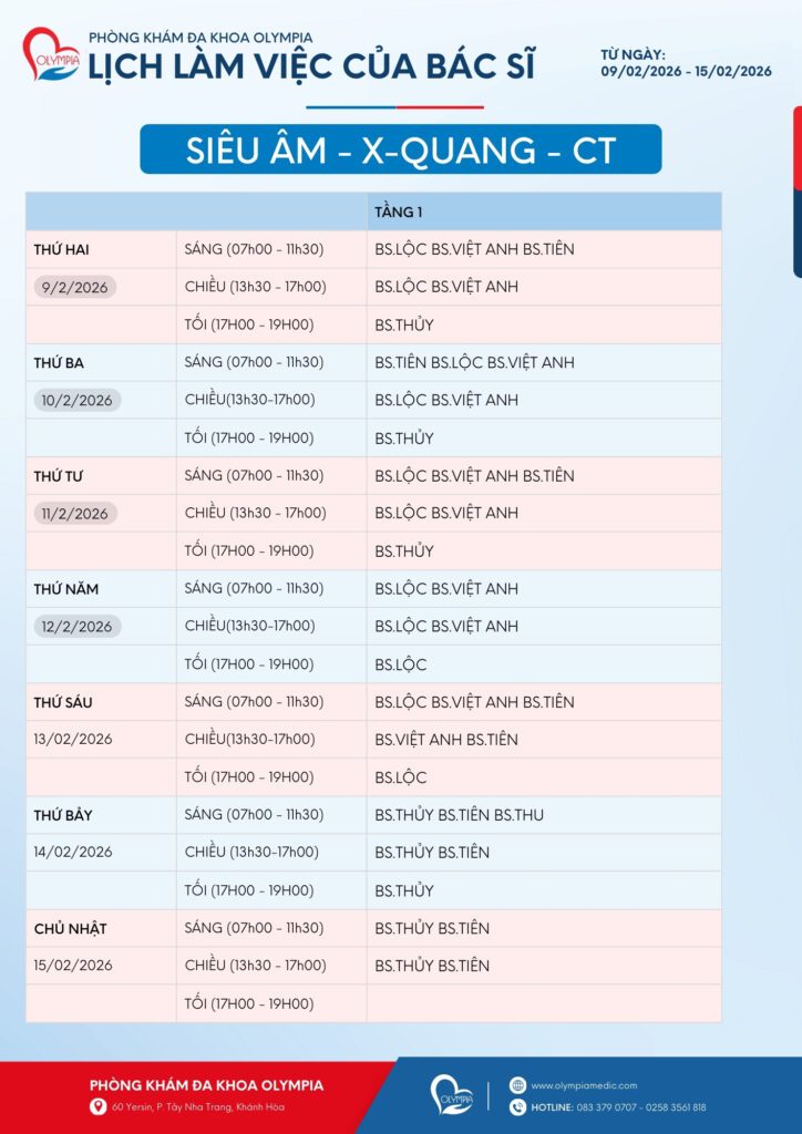 Lịch làm việc tuần 07 năm 2026 tại Phòng khám Đa khoa Olympia