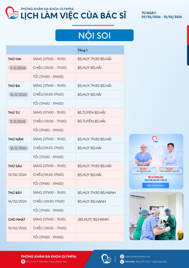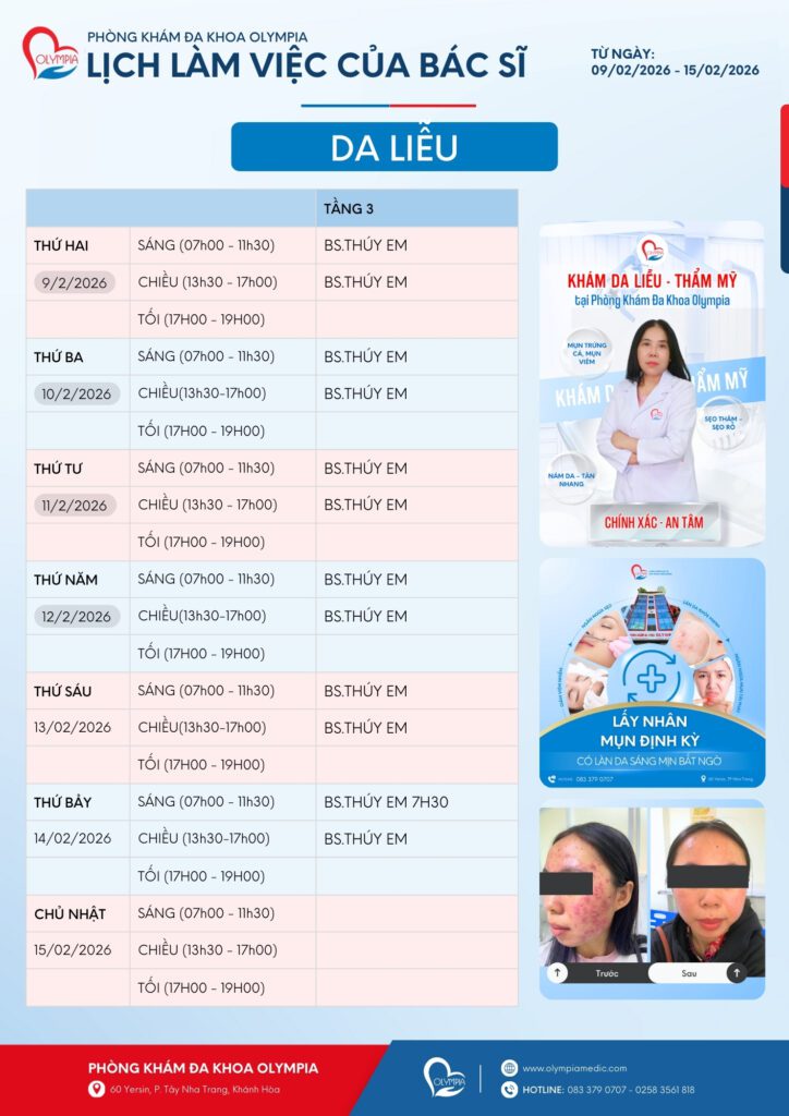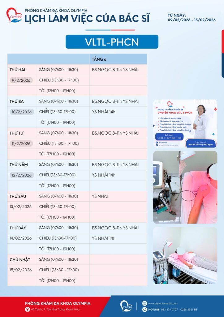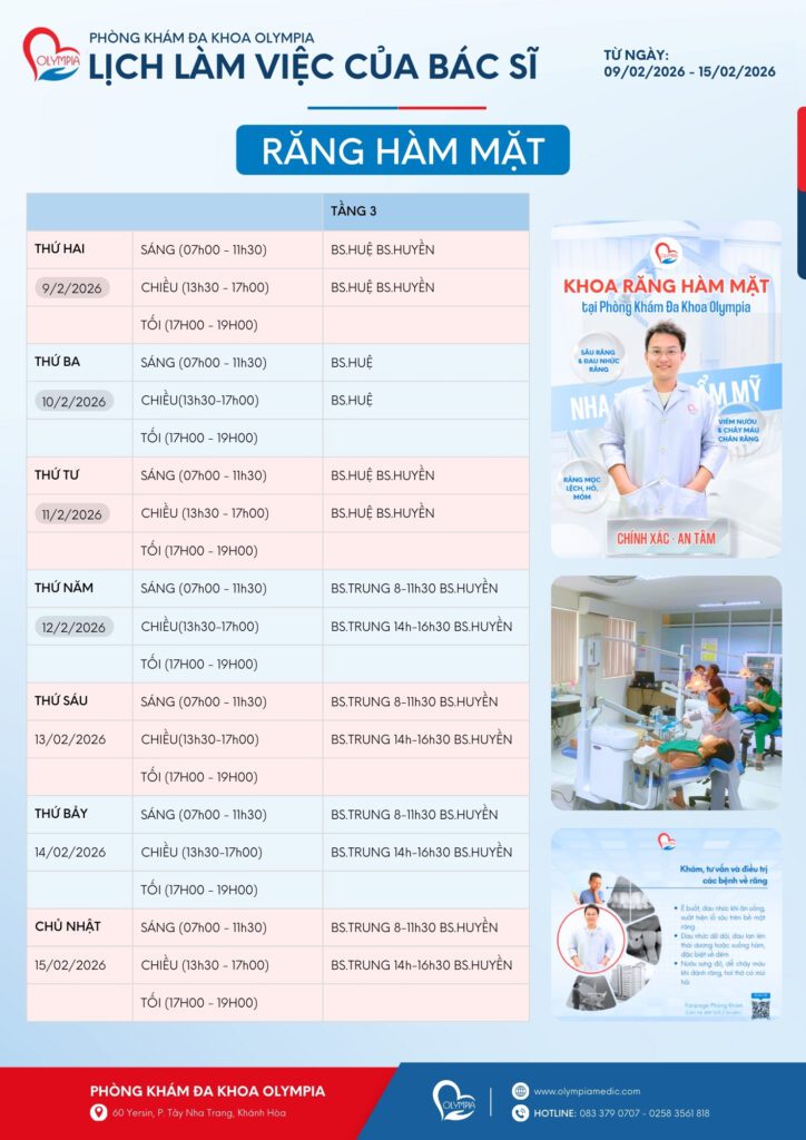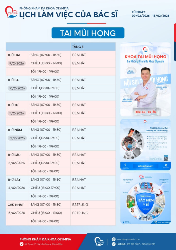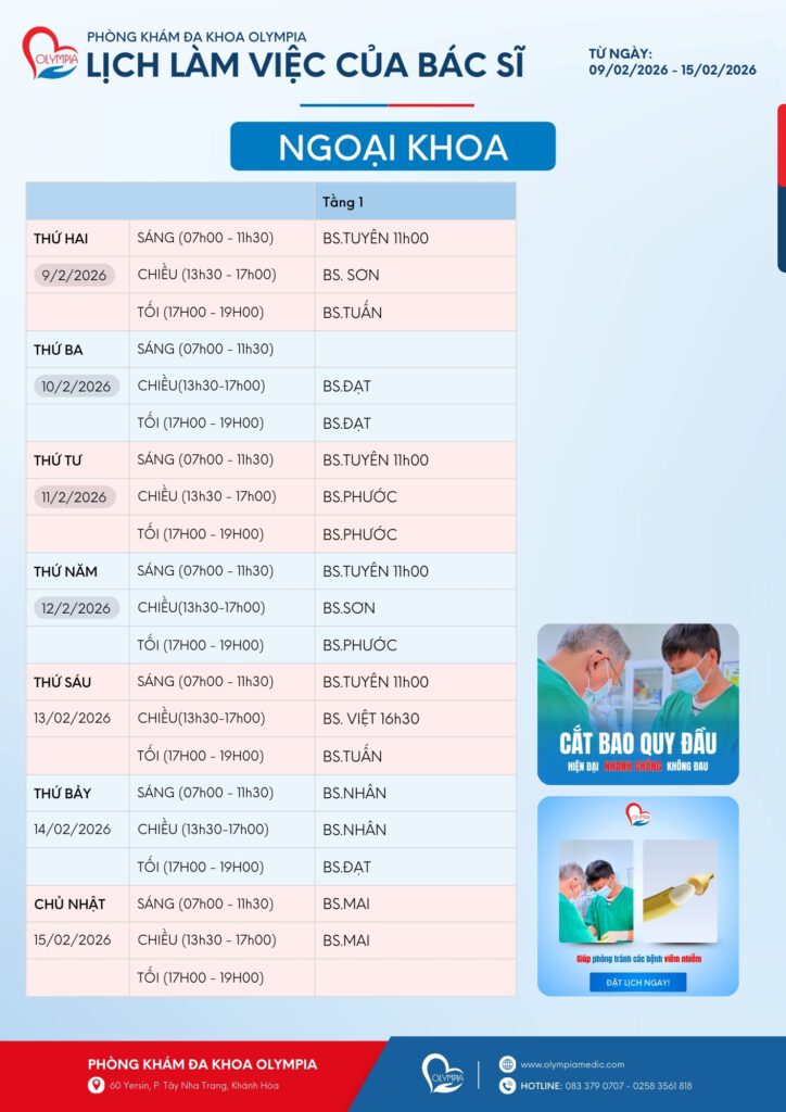 Lịch làm việc tuần 07 năm 2026 tại Phòng khám Đa khoa Olympia
