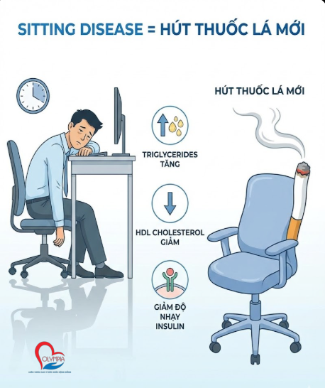 Thuật ngữ “Sitting Disease” (Bệnh ngồi nhiều) đã được y văn thế giới công nhận là một yếu tố nguy cơ độc lập gây tử vong sớm. Về mặt hóa sinh, khi cơ thể ở trạng thái nghỉ ngơi quá 6-8 giờ mỗi ngày, hoạt động của enzyme Lipoprotein Lipase (LPL) – chịu trách nhiệm phân giải chất béo trong máu – bị ức chế gần như hoàn toàn. Điều này dẫn đến sự gia tăng Triglyceride huyết tương, giảm HDL-Cholesterol (mỡ tốt) và giảm độ nhạy Insulin.