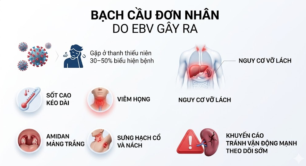 Đây là bệnh lý điển hình nhất do EBV gây ra. Ở thanh thiếu niên, khoảng 30 – 50% trường hợp nhiễm virus sẽ phát triển thành bệnh với các triệu chứng: